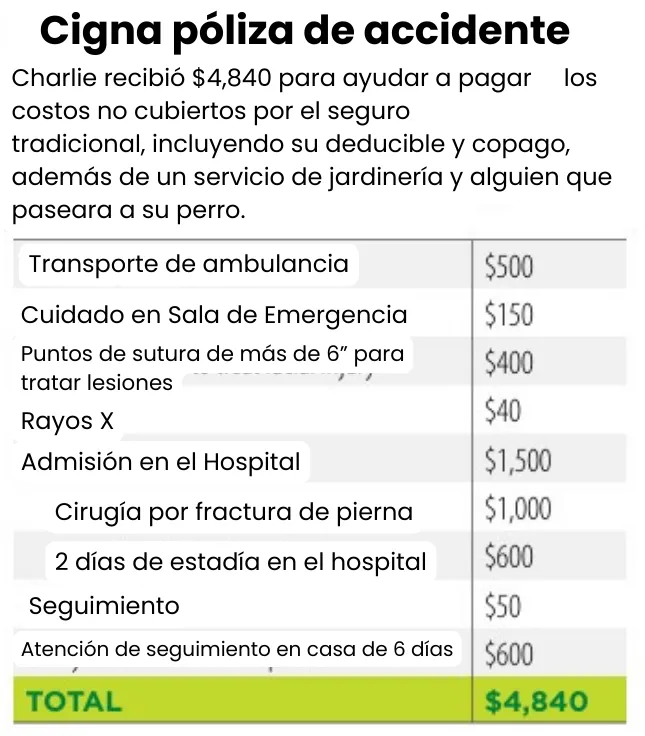 La póliza de accidente de Cigna le brindó a Charlie una ayuda económica de $4,840 para cubrir los gastos médicos de su accidente que no fueron cubiertos por su seguro tradicional. Además, se benefició de servicios prácticos como jardinería y cuidado de su perro durante su recuperación. La tabla detalla los costos estimados de los servicios médicos que probablemente necesitó Charlie a raíz de su accidente, sumando el total que recibió. Esto ilustra cómo una póliza de accidente puede ofrecer un apoyo financiero y logístico valioso en momentos inesperados.